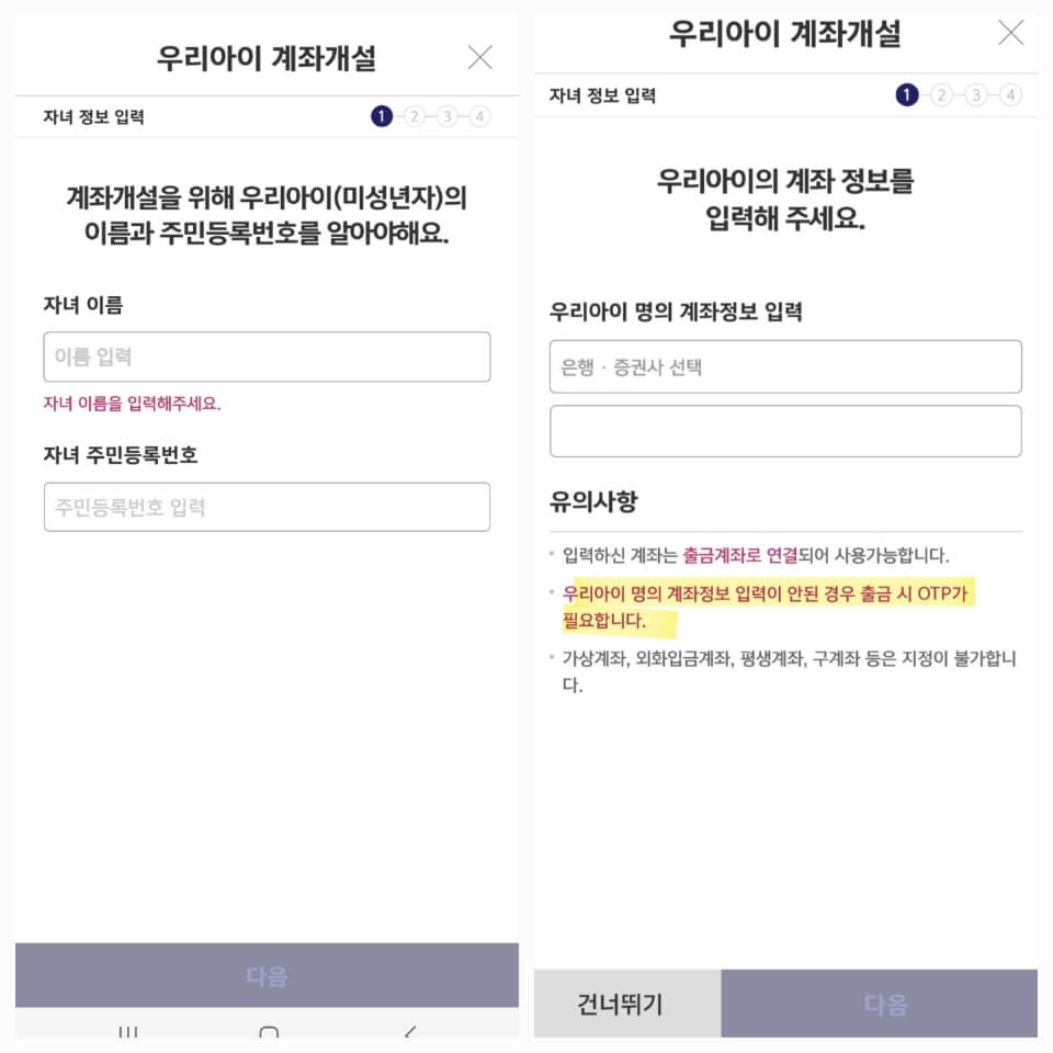 - 아이 정보(이름, 주민등록번호, 계좌정보)를 입력합니다. 여기서 계좌 정보는 선택사항이지만 미입력시 출금 시 OTP가 필요해 저는 입력하고 진행했습니다.