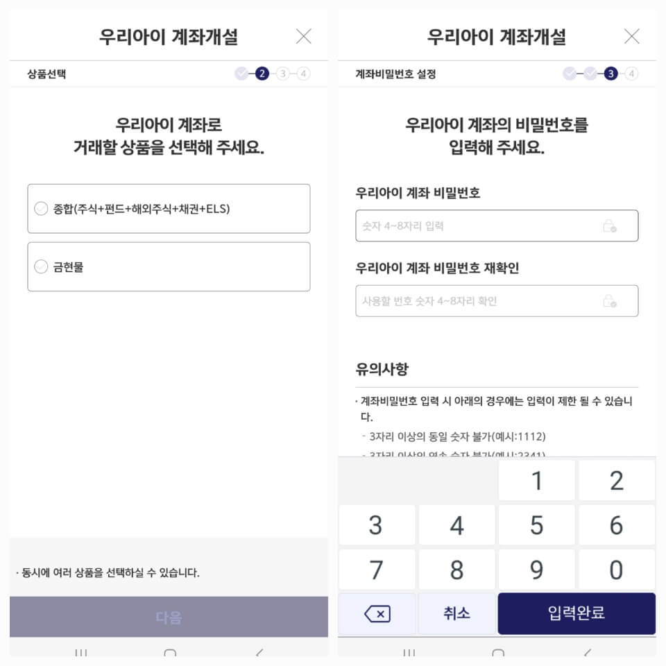 - 아이 계좌로 거래할 상품 선택 후, 계좌 비밀번호 설정을 합니다.