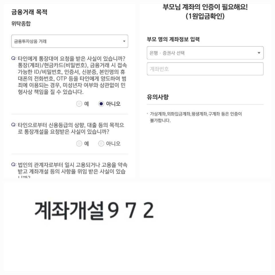 - 금융거래 목적 확인 후 부모의 계좌로 인증을 합니다. 계좌 개설 뒤 숫자 3개를 입력하면 됩니다.