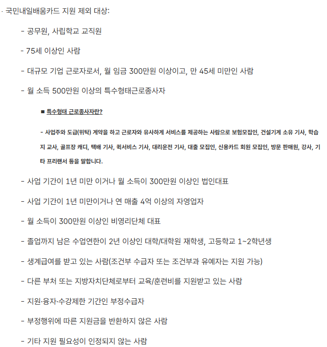 국민내일배움카드는 업무 능력을 키우고 싶거나 새로운 직무에 도전하고자 하는 국민 누구나 발급받을 수 있습니다. 하지만 일부 조건에 해당하는 경우에는 발급이 제한될 수 있습니다. 다음은 국민내일배움카드 제외 대상입니다.